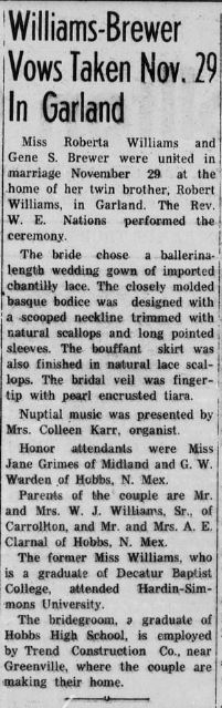 Miss Roberta Williams and gene S. Brewer were united in marriage November